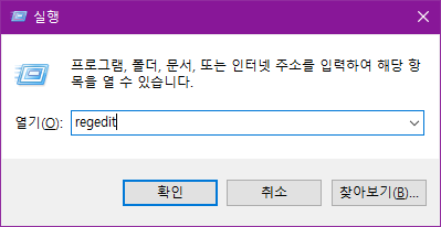 windows+R키를 눌러 실행을 엽니다. regedit를 입력한 후 확인 버튼을 클릭.