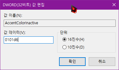새로 생성된 새 값 #1의 이름을 AccentColorInactive로 변경합니다. 변경된 키를 선택합니다. Dword (32비트) 값 편집 창이 열립니다.