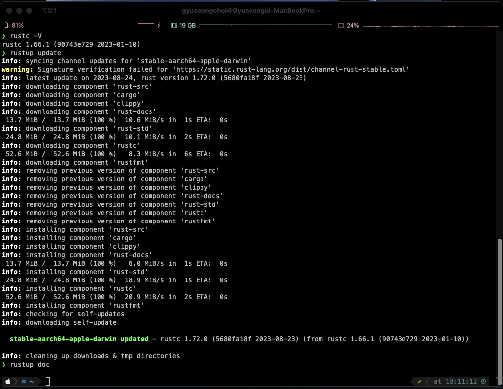 rustup update 명령으로 rust 컴파일러를 최신 버전으로 업데이트할 수 있다.